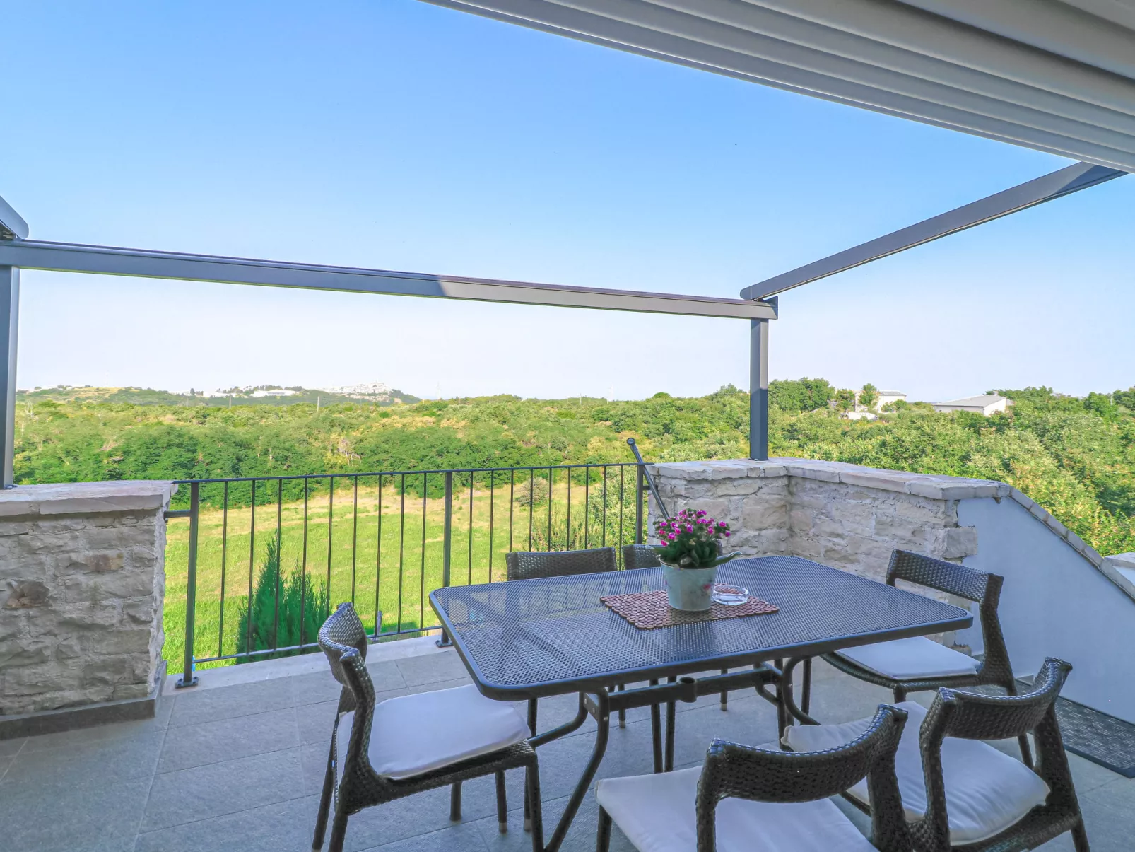 Mooi rijtjeshuis "Bibali", van 2 verdiepingen. In het gehucht Bibali, 2 km van het centrum van Buje, rustige, zonnige ligging tegen een helling, 12 km van zee. Voor medegebruik: terrein 2.000 m2 (omheind), tuin, openluchtzwembad hoekig (11 x 8 m, 100 - 150 cm diepte, seizoensgebonden beschikbaarheid: 15.Apr. - 15.Okt.) met trap. Buitendouche. In het huis: internetaansluiting, wasmachine, droger. Parkeerplaats bij het huis op het terrein. Winkel 2 km, restaurant 2 km, bushalte 2 km, treinstation 28 km, kiezelstrand 12 km. Golfterrein (18 holes) 17 km, tennis 1 km, manege 5 km, wandelroutes 1 km vanaf het huis, fietspad 1 km. De omgeving is gevoelig voor geluidsoverlast. Gelieve geen lawaai te maken en de rust te bewaren.