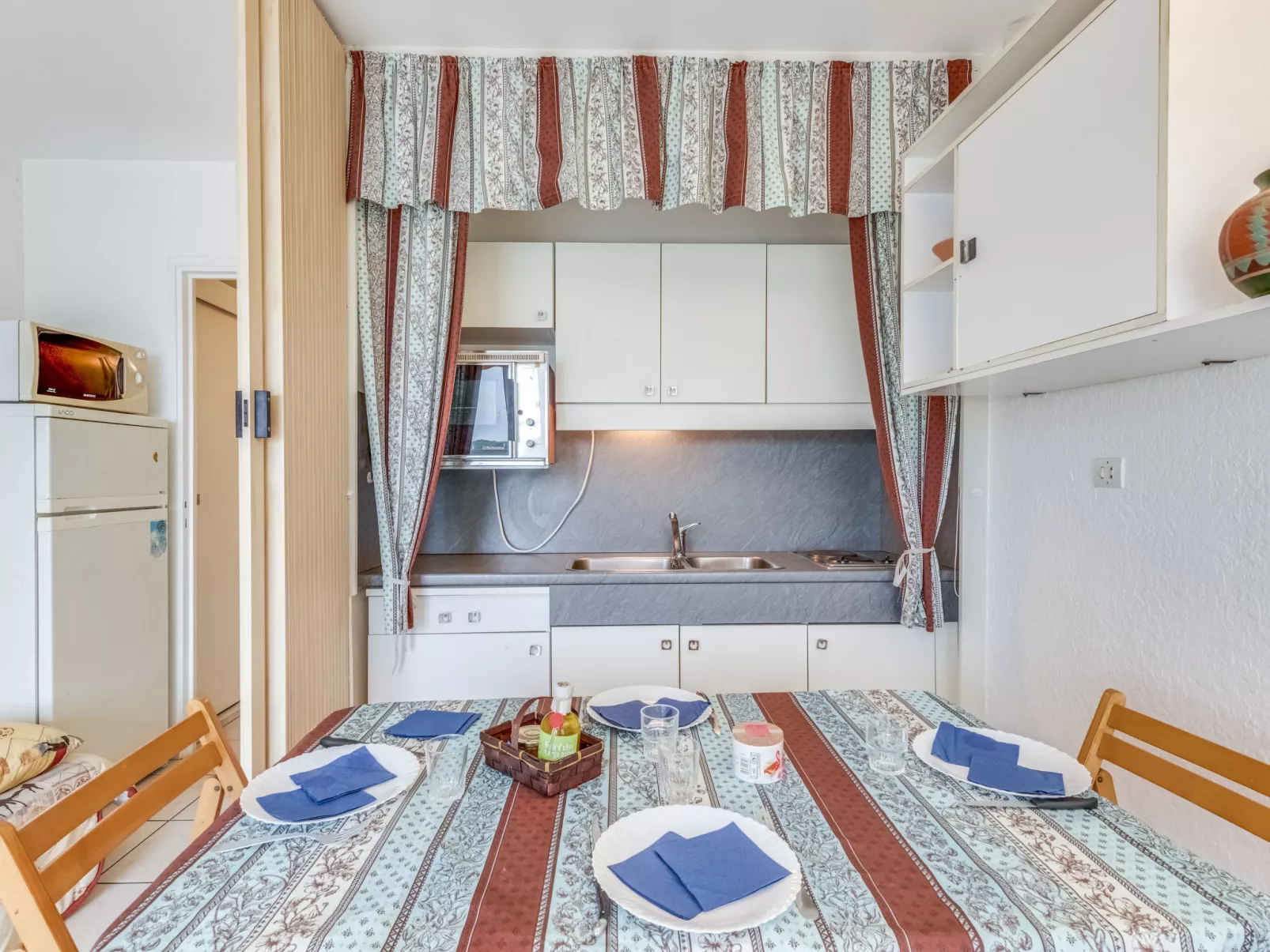 Studio 1-kamer 22 m2 op de 1e verdieping. Woon-/eetkamer met 2 2-pers divanbedden (140 cm, lengte 190 cm). Kookhoek (2-pits kookplaat, oven, magnetron, diepvriezer). Douche/WC. Verwarming. Terras 5 m2, op het oosten gelegen. Ter beschikking: Internet (WiFi, extra). Parkeerplaats. Woning aan de parkeer zijde. Niet rokers woning. Maximaal 1 huisdier/hond toegestaan. Rookmelders.