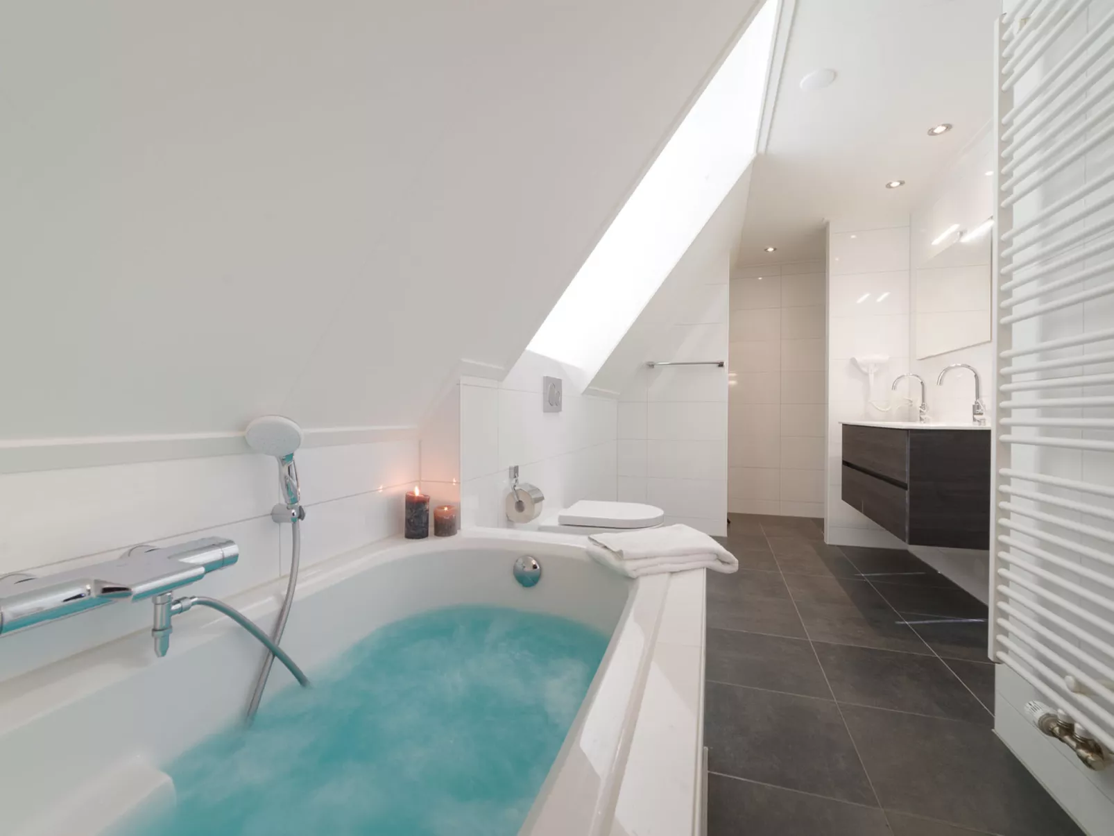 "8 persoons Dijkwoning", huis in een rij 5-kamers 126 m2. Comfortabel ingericht: woon-/eetkamer met eettafel en TV (Flatscreen TV). Uitgang naar de tuin, naar het terras. 1 kamer met 2 bedden (90 cm, lengte 210 cm), TV (Flatscreen TV). Berging. Open keuken (oven, afwasmachine, 4 inductiekookplaten, waterkoker, magnetron, elektrische koffiemachine, pads voor de koffiemachine (Nespresso-not incl.)). Douche/WC, Sauna. Vloerverwarming. Bovenverdieping: 3 kamers, elke kamer heeft 2 bedden (90 cm, lengte 210 cm), TV (Flatscreen TV). Bad/douche/WC. Tuin. Terrasmeubelen, barbecue. Ter beschikking: wasmachine, droger, haardroger. Internet (WiFi, gratis). Parkeerplaats bij het huis. Rookmelders. Huisdier op aanvraag.
