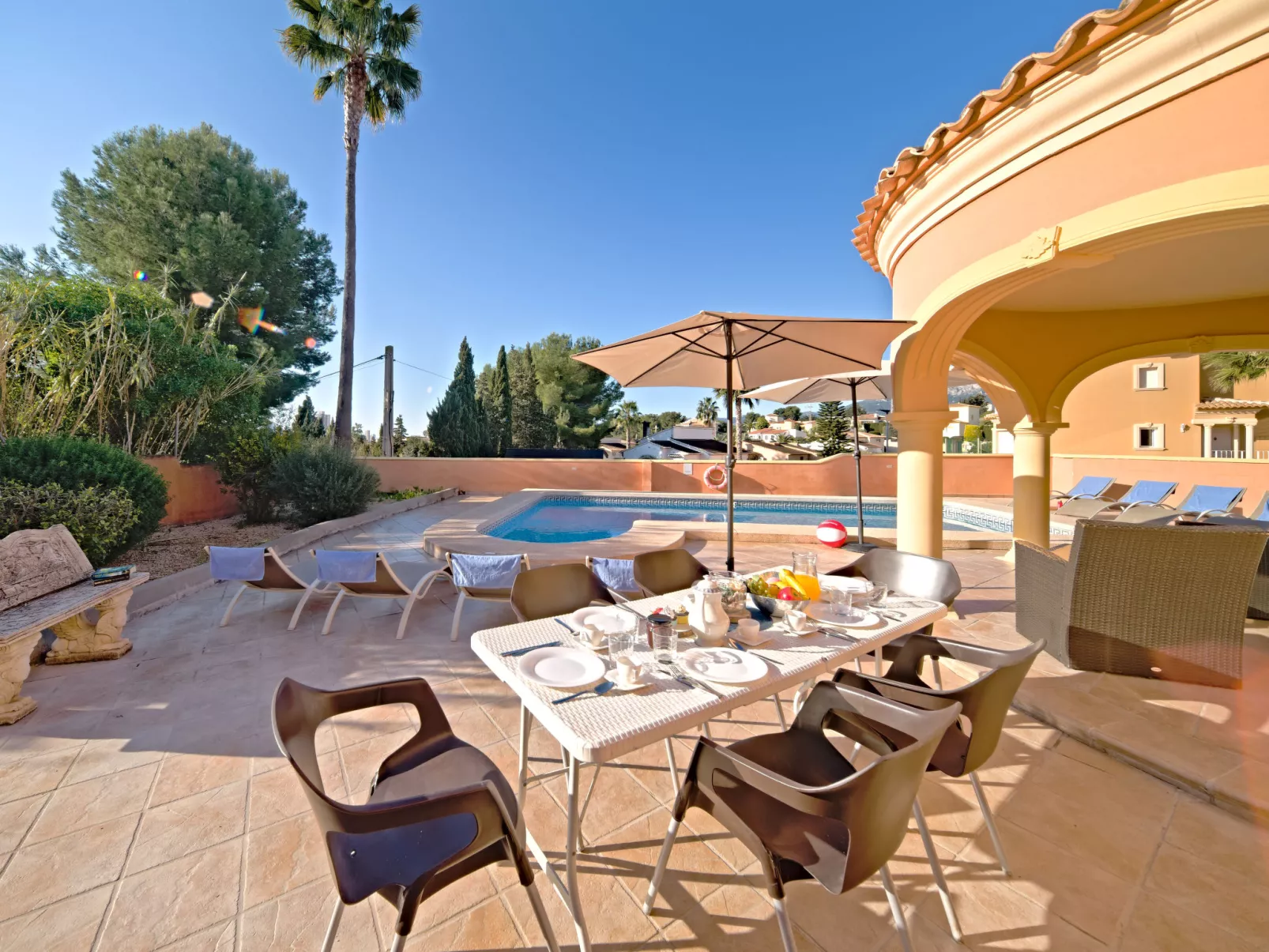 "Gardenia", villa 5-kamers 218 m2. Ruim, comfortabel ingericht: woon-/eetkamer met eettafel, Sat-TV, internationale TV-zenders, air-conditioning en heteluchtverwarming. Uitgang naar het terras. 1 kamer met 1 2-pers bed (135 cm, lengte 190 cm), bad/bidet/WC, air-conditioning en heteluchtverwarming. 1 kamer met 2 bedden (90 cm, lengte 190 cm), air-conditioning en heteluchtverwarming. Keuken (oven, afwasmachine, 4 keramische glas kookplaten, broodrooster, waterkoker, magnetron, diepvriezer, elektrische koffiemachine). Aparte WC. Bovenverdieping: 2 kamers, elke kamer heeft 2 bedden (90 cm, lengte 190 cm), air-conditioning en heteluchtverwarming. 1 kamer met 2 bedden (90 cm, lengte 190 cm), bad/WC, air-conditioning en heteluchtverwarming. Douche/WC. Terras, zithoek in de tuin. Terrasmeubelen, barbecue, ligstoelen. Uitzicht op de bergen en het zwembad. Ter beschikking: wasmachine, strijkijzer, kinderstoel, kinderbed tot 2 jaar. Internet (WiFi, gratis). Parkeerplaats. Maximaal 2 huisdieren/honden toegestaan. AT-456321-A // Reg. Nr.: ESFCTU00000302900049031100000000000000000AT-456321-A9