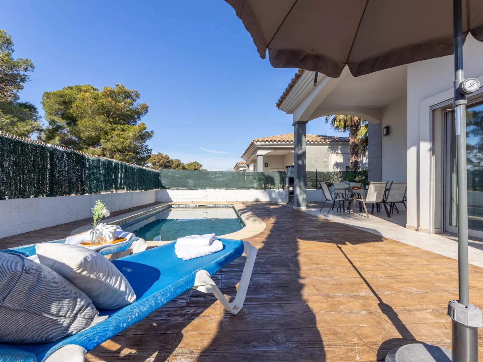 "Gaviota 14", huis 4-kamers 89 m2, op de begane grond. Comfortabel en mooi ingericht: woon-/eetkamer met eettafel, Digitale TV, air-conditioning en heteluchtverwarming. Uitgang naar de zitplaats in de tuin, naar het zwembad. 1 2-pers. kamer met 1 2-pers bed (135 cm, lengte 190 cm), douche/WC. 2 2-pers. kamers, elke kamer heeft 2 bedden (90 cm, lengte 190 cm). Keuken (oven, 4 keramische glas kookplaten, broodrooster, magnetron, diepvriezer, elektrische koffiemachine). Bad/bidet/WC. Air-conditioning, heteluchtverwarming. Terrasmeubelen, barbecue, ligstoelen (2), loggia. Ter beschikking: wasmachine, strijkijzer, klamboe. Internet (WiFi, gratis). Parkeerplaats (omheind) bij het huis. Geschikt voor families. Maximaal 2 huisdieren/honden toegestaan. HUTTE000932 // Reg. Nr.: ESFCTU00004301900065882600000000000000000HUTTE0009326