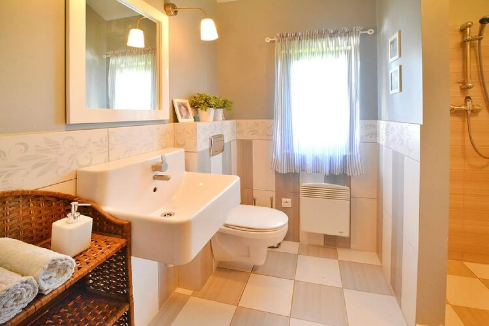Het comfortabele vakantiehuis met één verdieping biedt gasten een ruime woonkamer die verbonden is met een goed uitgeruste keuken. De woonkamer heeft een open haard, tv en een tafel met stoelen. Er zijn 4 slaapkamers en 2 badkamers beschikbaar voor de gasten. Er is een wasmachine. Het huis is voorzien van verwarming (elektrisch en extra met een houthaard). Het huis beschikt over een groot, overdekt terras met comfortabel tuinmeubilair en barbecuebenodigdheden. Draadloos internet is beschikbaar.