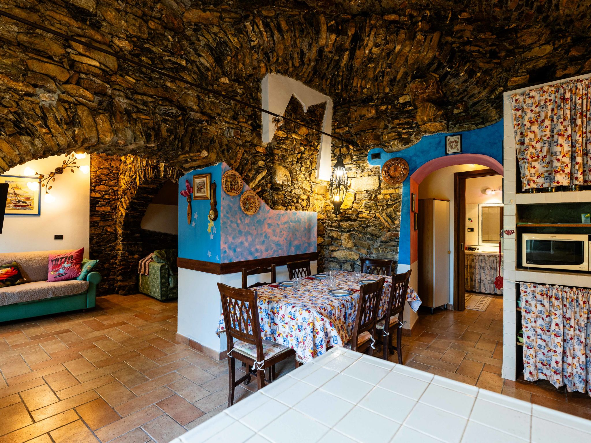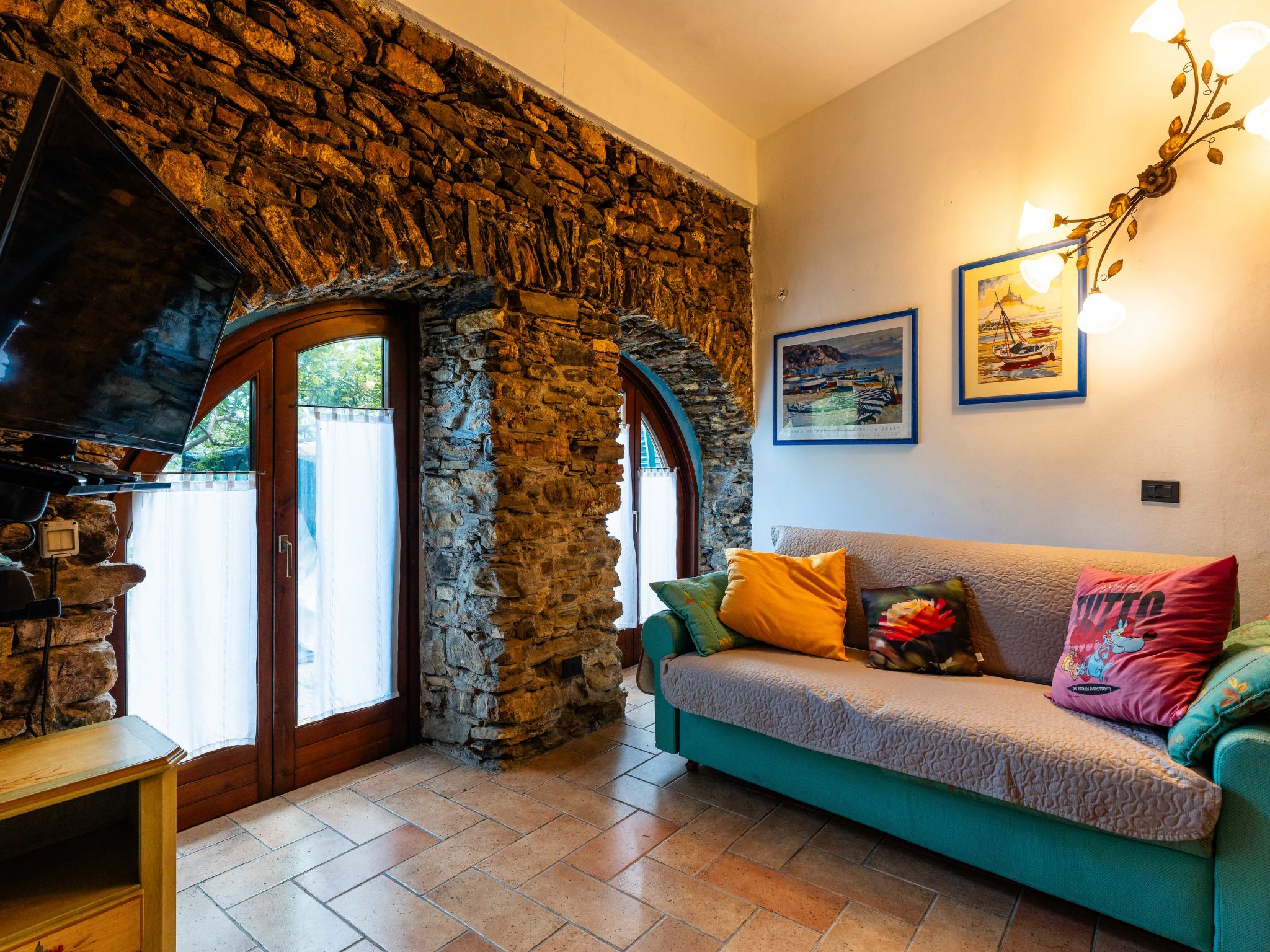 "La Bouganville - Rustico con giardino", appartement 2-kamers 60 m2, op de begane grond. Rustiek ingericht: woon-/eetkamer met 1 2-pers divanbed en open haard (alleen decoratie), TV. Uitgang naar de zitplaats in de tuin. 1 open kamer, zonder ramen met 1 bed (120 cm). Open galerij met 1 2-pers bed. Open keuken (mini-oven, oven, afwasmachine, Gasfornuis, 4 kookpitten (vlammen), magnetron, diepvriezer, elektrische koffiemachine) met eettafel. Uitgang naar de tuin. Bad/bidet/WC, dubbele wastafels. Gas-verwarming. Verwarming alleen beschikbaar van 01.11. tot 15.04. Natuurstenen vloeren. Zithoek in de tuin 10 m2. Terrasmeubelen. Ter beschikking: wasmachine, strijkijzer, haardroger. Internet (WiFi, gratis). Maximaal 1 huisdier/hond toegestaan. Privé ingang, rookmelders, brandblusser. IT009006C2Q66GRUK3