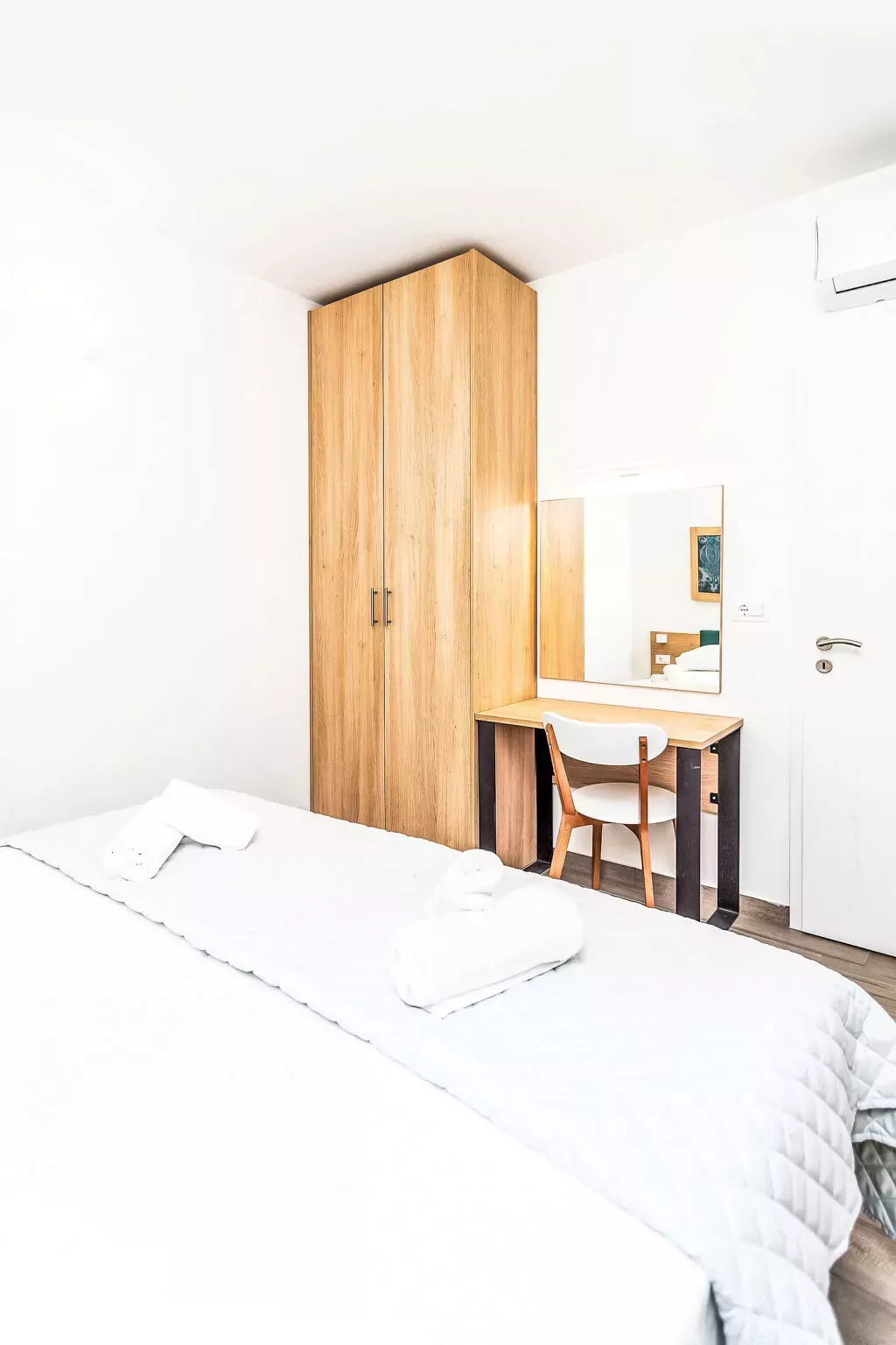 Appartement 2-kamers 42 m2, op de begane grond, op het zuiden gelegen. Woon-/eetkamer met 1 2-pers divanbed (160 cm, lengte 200 cm), Sat-TV (Flatscreen TV), air-conditioning. Uitgang naar het terras. 1 kamer met 2 bedden (90 cm, lengte 200 cm), air-conditioning. Open keuken (2 keramische glas kookplaten, magnetron, elektrische koffiemachine). Douche/WC. Geen verwarmingsmogelijkheid. Terras 10 m2, overdekt. Terrasmeubelen. Ter beschikking: kinderbed (extra). Internet (Internet (WiFi), gratis). Maximaal 1 klein huisdier/hond toegestaan. De huizen liggen op 160-250 m van de zee en het strand.