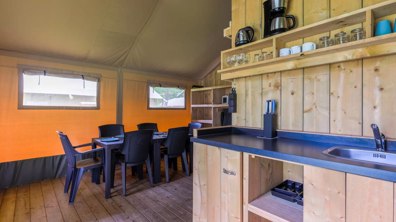 Je onderkomen is een ruime tent met echte bedden met heerlijke matrassen een fijne keuken en veranda en zelfs je eigen sanitair. De camping ligt in een zeer bosrijke omgeving. De camping beschikt over zwembaden, speelweides, speeltuinen, midgetgolf en een leuke kinderanimatie. Hier vervelen ze zich geen moment en hebben papa's en mama's echt rust. Huur een fiets voor een dagje uit