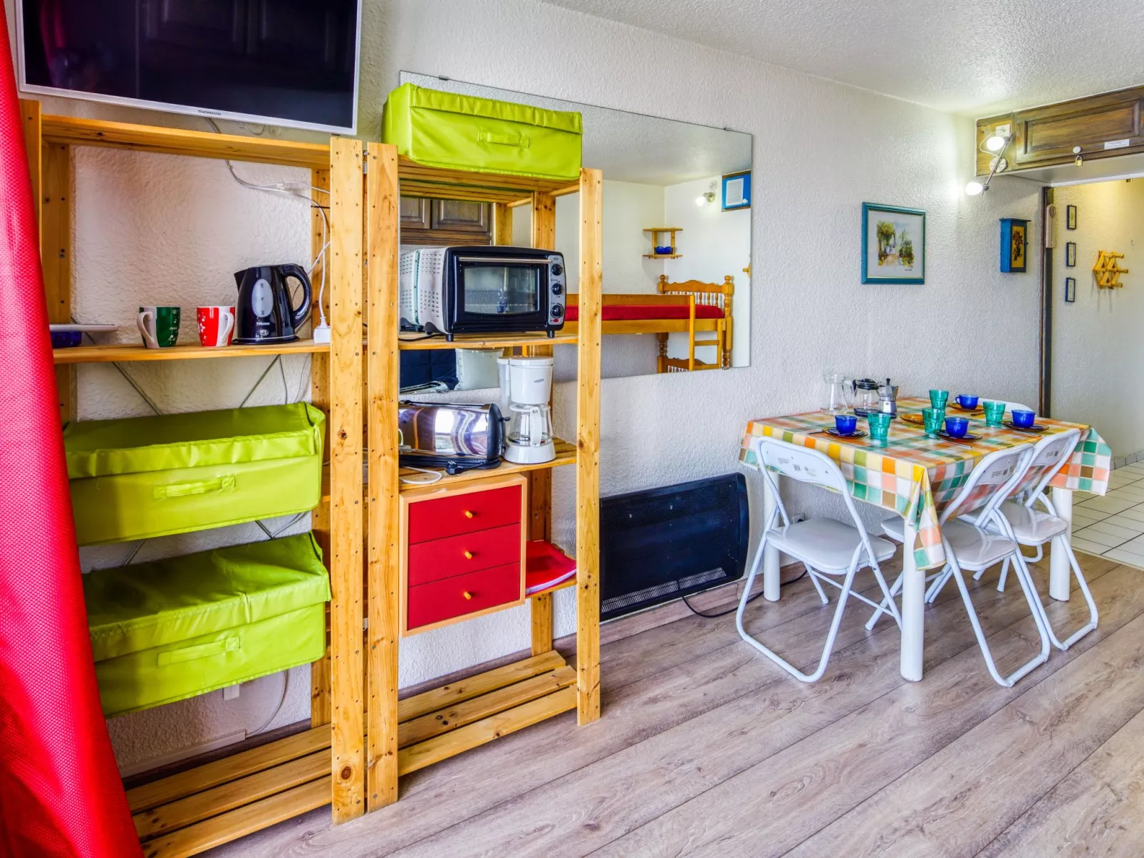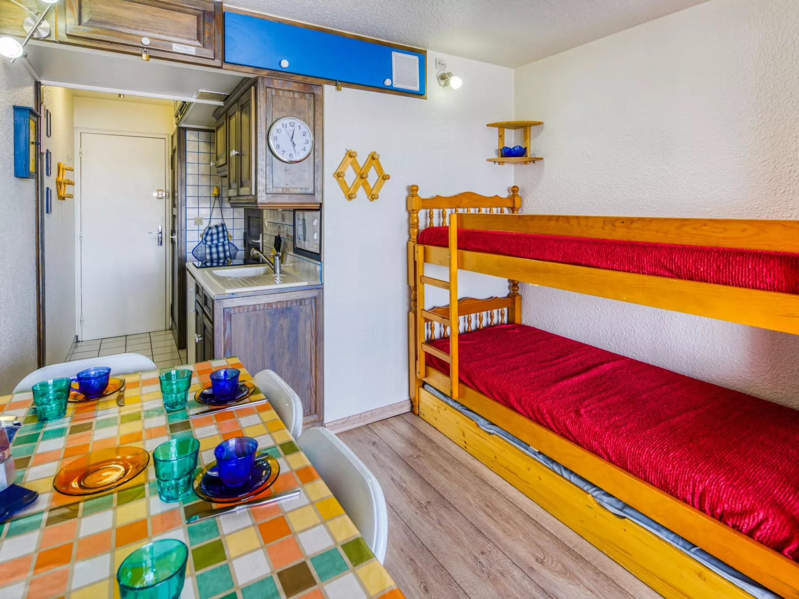 Studio 1-kamer 22 m2 op de 7e verdieping, op het noorden gelegen. Eenvoudig en mooi ingericht: woon-/eetkamer met 1 2-pers divanbed (130 cm, lengte 190 cm), 1 x 2 stapelbedden (90 cm, lengte 190 cm), TV (Flatscreen TV). Uitgang naar het balkon, op het noorden. Kookhoek in de hal (2-pits kookplaat, mini-oven, broodrooster, waterkoker, magnetron, elektrische koffiemachine). Bad/WC. Elektrische verwarming. Parketvloeren. Balkon 4 m2, op het noorden gelegen. Balkonmeubilair. Uitzicht op de bergen en het dal. Ter beschikking: strijkijzer, haardroger. Internet (Internet (WiFi), extra). Niet rokers woning. Maximaal 1 huisdier/hond toegestaan. Rookmelders. Aanbod door een particulier volgens art. 155, IV van CGI.