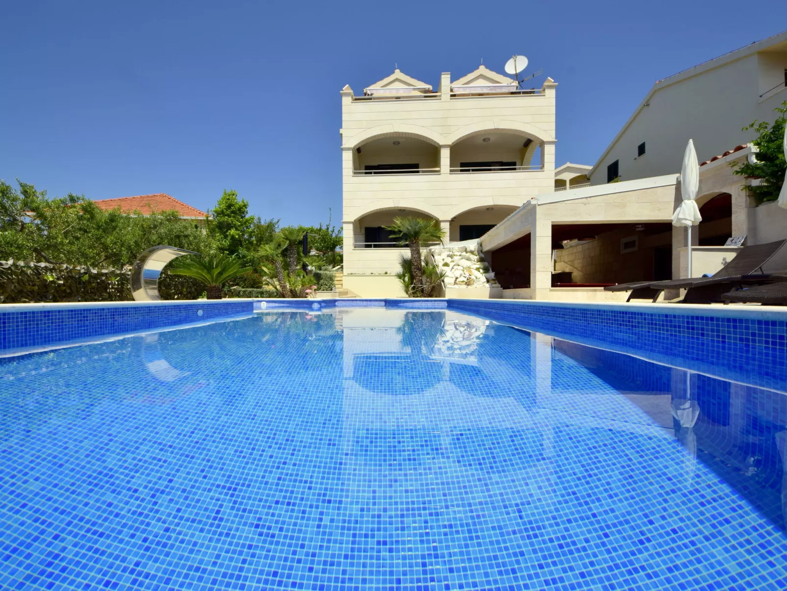Okrug Gornji (Čiovo), 6 km van Trogir: Mooi appartementencomplex "Villa Andjelka". 1 km van het centrum van Okrug Gornji, rustige, zonnige, verhoogde ligging, 50 m van zee, 50 m van het strand. Voor medegebruik: terrein, openluchtzwembad verwarmd (38 m2, 130 - 160 cm diepte, seizoensgebonden beschikbaarheid: 25.Apr. - 03.Okt.) met trap. WC bij het zwembad, buitendouche, poolhouse met koelkast, terras, tuinmeubelen, barbecue. In het huis: internetaansluiting, sauna (extra). Wasmachine, droger. Wissel van handdoeken 2 maal per week. Parkeerplaats bij het huis op het terrein. Oplaadstation. Winkel 200 m, restaurant 1 km, café 1 km, bushalte 1.7 km, kiezelstrand 500 m, rotsstrand 50 m. Vergelijkbare accommodaties kunnen worden geboekt. Zwembad met stroming en hydromassage. Voor medegebruik: buitenkeuken.